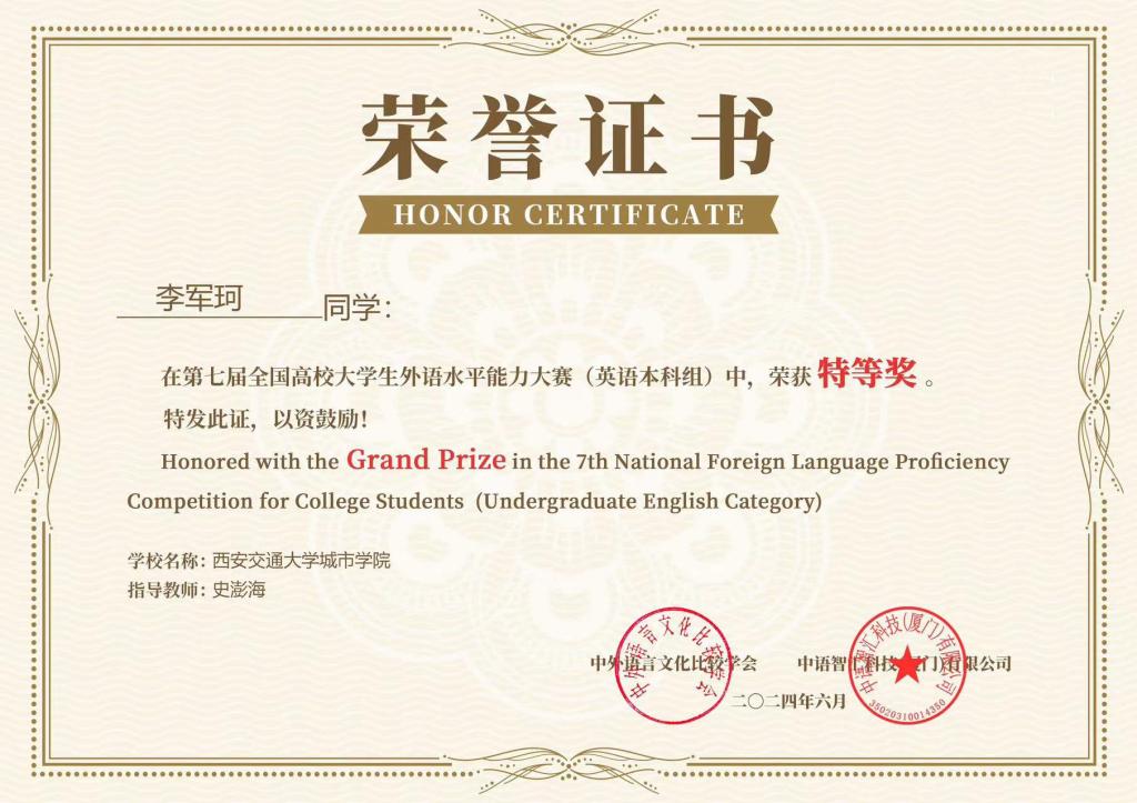 近日,第七届全国高校大学生外语水平能力大赛落下帷幕,我校外国语学院学生喜获佳绩,参加英语本科组及大学英语赛道的三名学生获特等奖,另有多名学生获一、二、三等奖;外国语学院教师史澎海、吴夫迎、樊华获“优秀指导老师奖”,beat365中文官方网站城市学院荣获“最佳院校组织奖”。