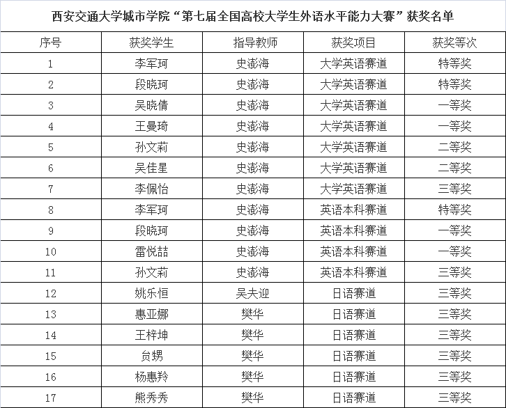 beat365中文官方网站城市学院“第七届全国高校大学生外语水平能力大赛”获奖名单