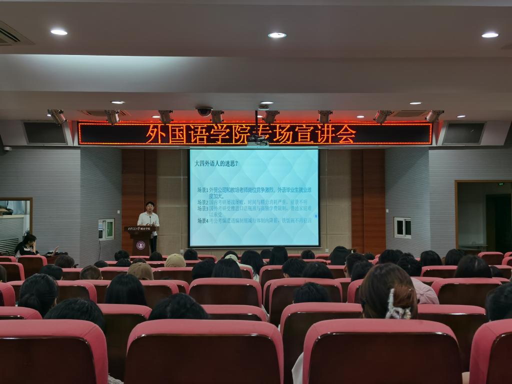 为给毕业生提供更多就职岗位和职业发展机会,10月15日,外国语学院在F100召开2025届毕业生专场宣讲会,本次会议邀请江苏亿涛对外经济合作有限公司刘英杰作为主讲人,学生工作负责人吴丹及2025届全体毕业生参加。