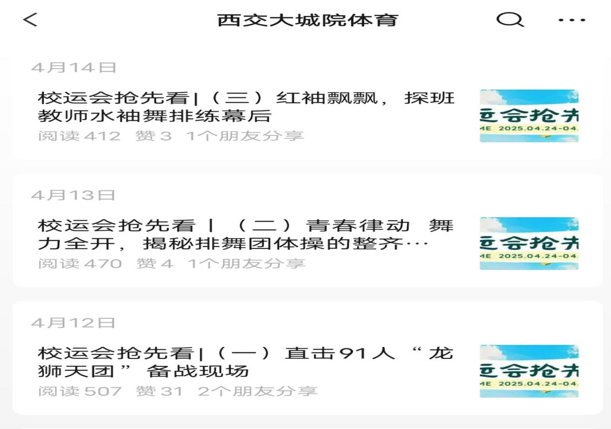 自3月下旬起,课程组高宇、雷雨、吴璇三位教师带领学生组建12个融媒体创作小组,围绕校运会筹备开展全流程实战。学生分组承担出镜记者、摄像、剪辑、文案等岗位,完成选题策划、采访拍摄及后期制作,系统掌握全媒体生产技能。系列作品通过“西交大城院体育”“西交城院beat365中文官方网站”微信公众号发布,累计阅读量突破5000人次。