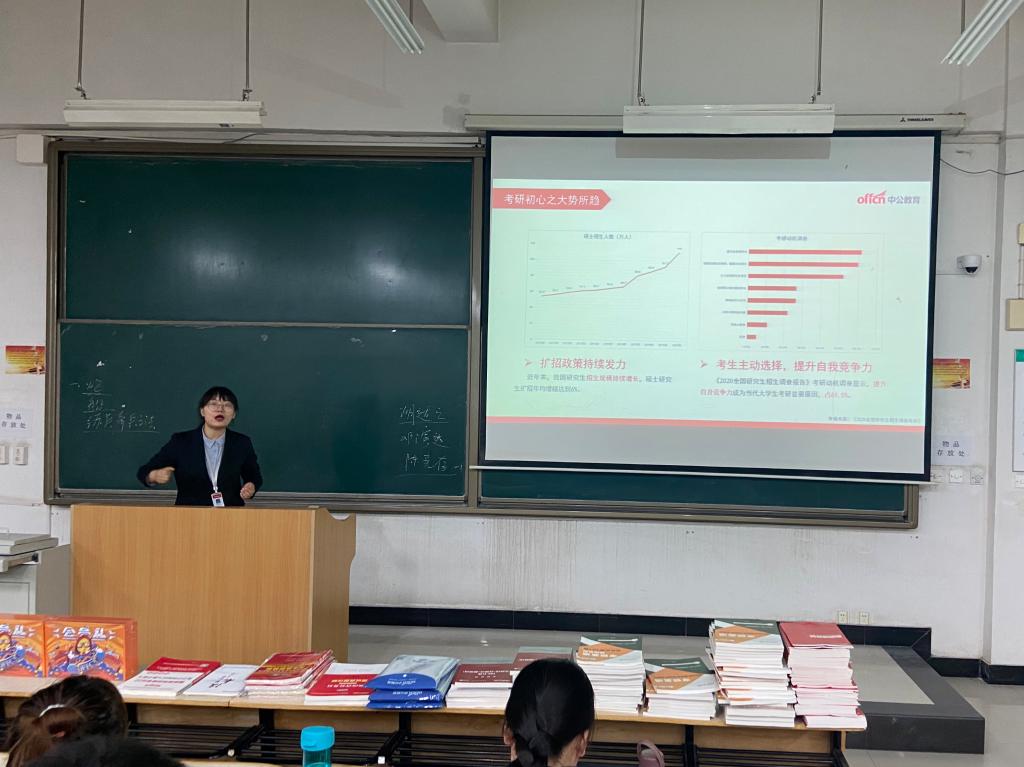讲座开始,陈聪老师开门见山、以幽默诙谐的语言和大家打成一片,首先向大家讲解了考研的优势和重要性,其中的利弊与当今时代对研究生的需求;同时清晰的向大家展示了当今市场对本科生与研究生的需求,本科生与研究生就业现状的区别;其次讲到同学们身为本科生应当以什么为目标,应当怎么做。陈聪老师的生动讲解让同学们明白,考研不是唯一的途径,但却是最实际的途径。