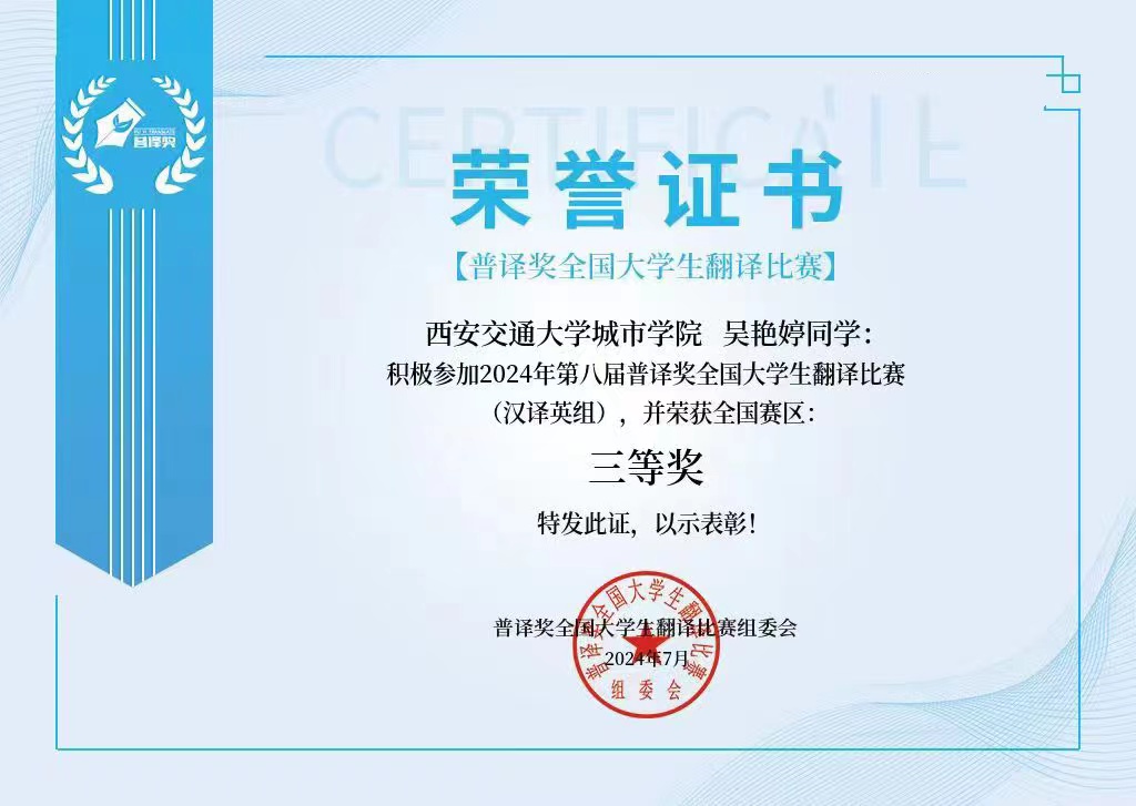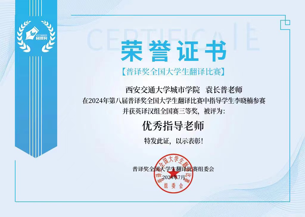 近日,第八届“普译奖”全国大学生翻译比赛决赛结果揭晓,我校外国语学院英语专业学生获得汉译英组全国三等奖1项、英译汉组全国三等奖2项。外国语学院被评为“优秀协办单位”,袁长普、张慧被评为“优秀指导老师”。